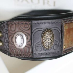 One of the key elements that sets Workshop SAURI’s collars apart is the captivating antique brass nameplate. This beautiful brass plate serves as a canvas where we artfully engrave your dog’s name, transforming each collar into a truly unique and special piece. Alongside your dog’s name, there are other engraved ornaments, such as spears, owls, lions, wolves, different symbols and patterns.